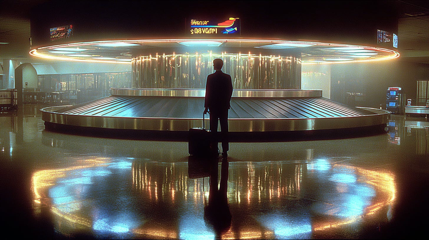 We're standing at the baggage carousel, watching bags circle, waiting for ours.